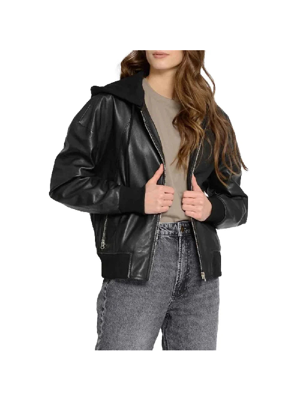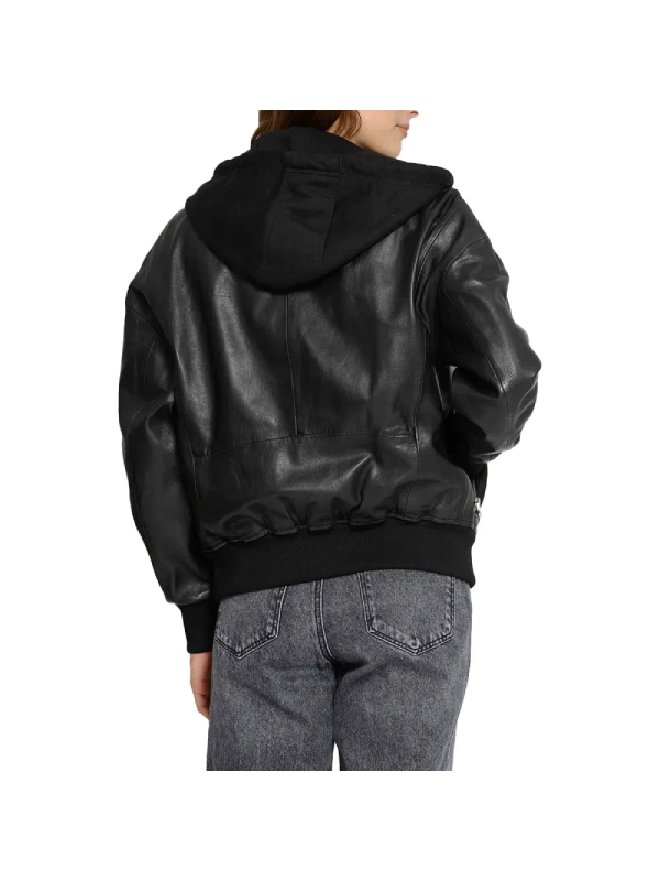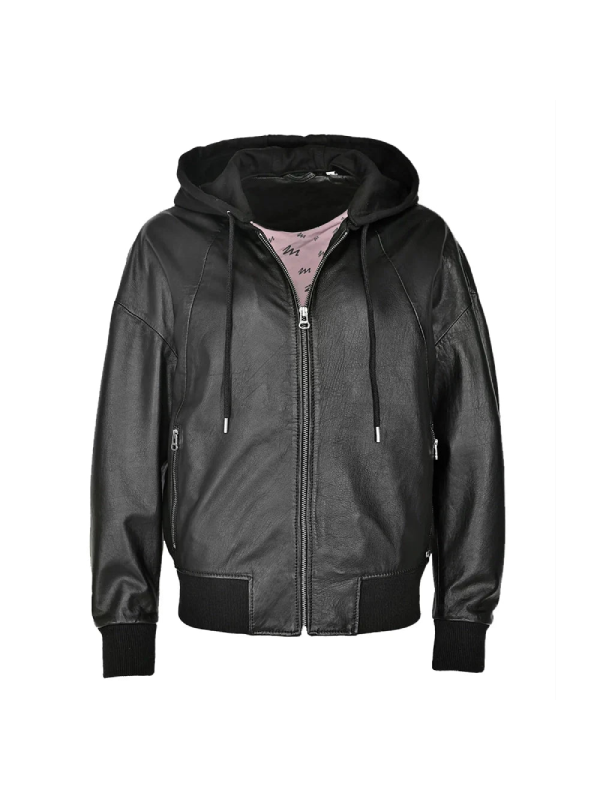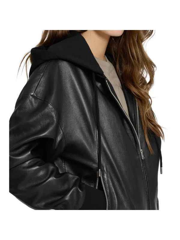 Elevate your outerwear collection with the Women’s Black Hooded Leather Bomber Jacket, where style meets functionality.