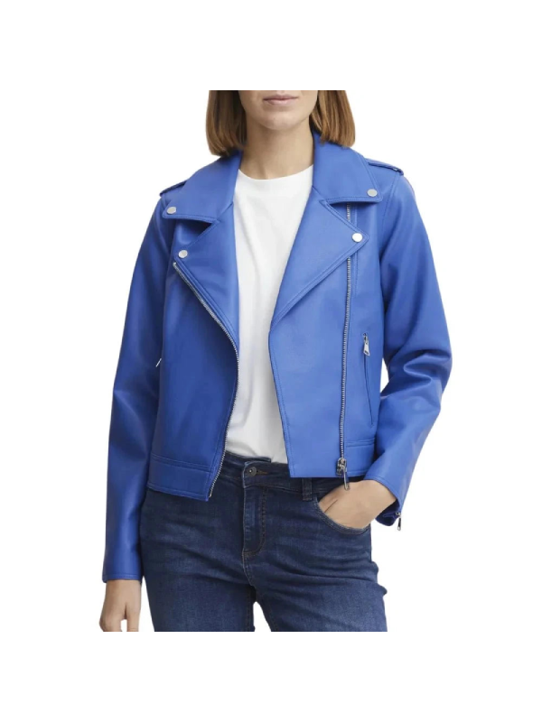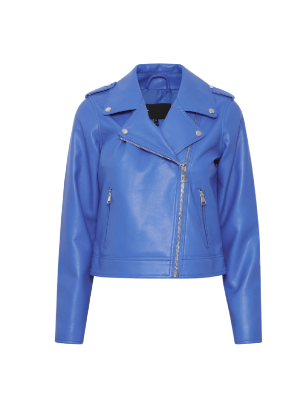 The light blue color is a refreshing touch to the traditional moto jacket design, which makes it have a feminine but bold character. Its smooth lines, asymmetrical front zipper, and tailoring fit perfectly to your figure, but still gives that carefree cool biker feel.